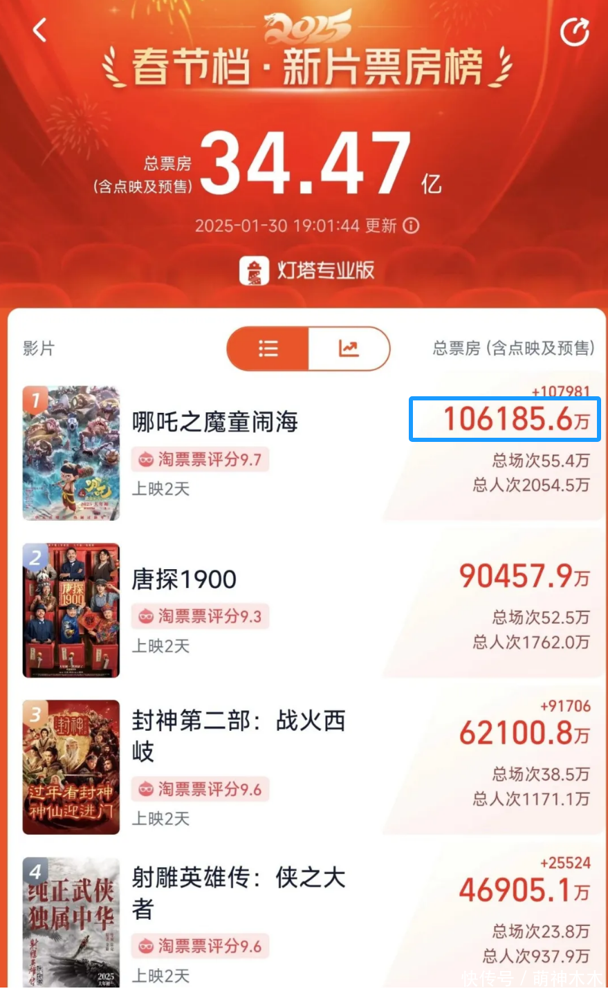 春节档首部票房破10亿的电影它来了!没错,等于口碑和票房双丰充的《哪吒之魔童闹海》。截止当今,《哪吒》的票房超越第二名《唐探》一个多亿,第三名第四名更是被断层式超越。