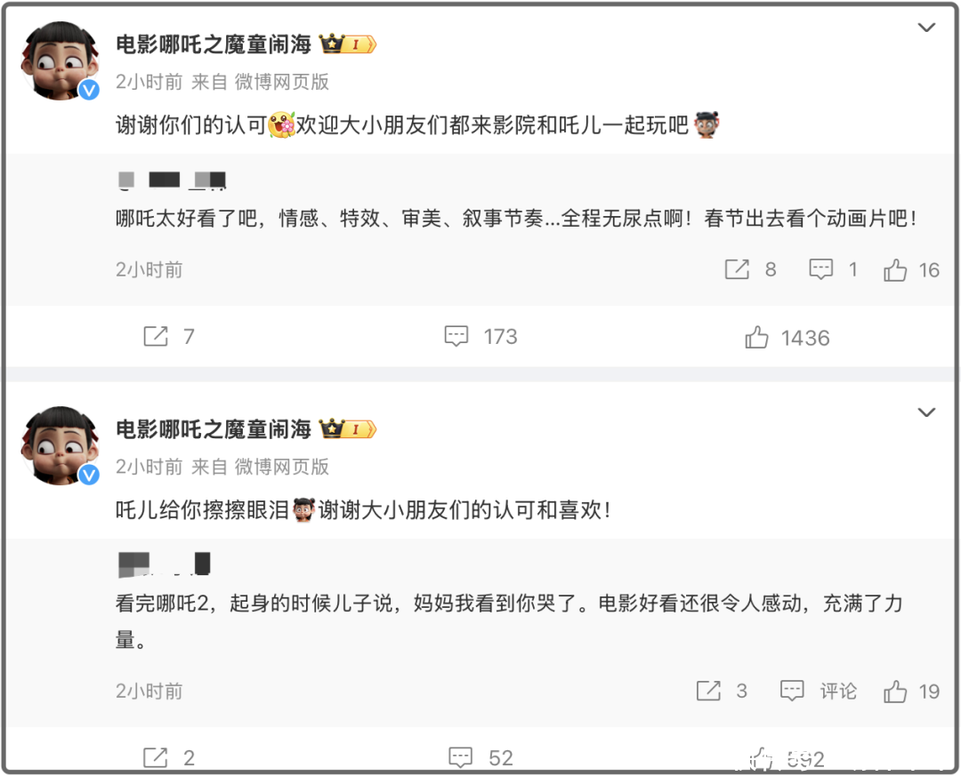 而在电影上映本领,《哪吒》官博还更新了不少电影网友批驳和花絮。有不少不雅众看完电影后王人会发表不雅后感,《哪吒》官博亦然随即挑选行运路东说念主,转发他们的信得过批驳。