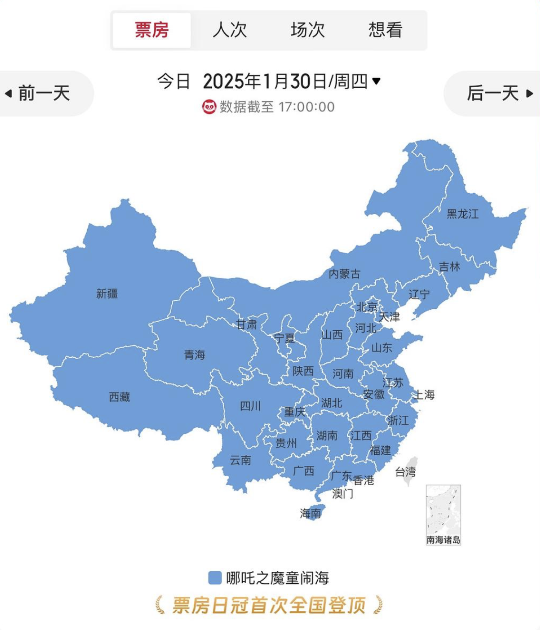 不仅如斯,《哪吒》单日票房初度宇宙登顶,可以看到各省份票房第一的电影,王人是《哪吒》。