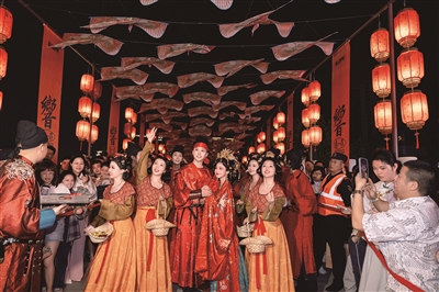 据悉,2024年,梧田老街一方面鼎力培育品牌特质行为,以古风节庆重现水乡繁盛,上元节、绣花节、音乐节、梧田市场四大品牌行为延续全年,不休带给市民和搭客新体验。已往年为例,其已接连举办梧田老街上元节、绣花节、音乐节、周年庆行为。“像周年庆咱们就以唐风元素为干线,顶住梧田盛世、祝贺酒池、唐宫夜宴等十二大场景,植入麒麟机甲巡游、域见古风市场、习惯演绎等系列行为,招引宽阔市民体验打卡。”梧田老街运营方示意,仅7天时刻就累计招引客流量近63万东谈主次,交易额赞助1400万元。