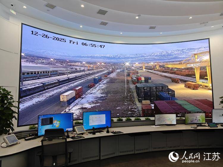 中哈(连云港)物流互助基地数字化转移中心大屏上可表露“霍尔果斯—东门”无水港现场情况。东谈主民网 李欣阳摄