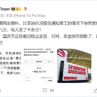 凭据博主邹晨辉Finan发布的截图,一位疑似比亚迪职工的帖子浮现,他正为十一假期与女友的出行运筹帷幄发愁,因为手头不便,选拔有限。没念念到9月26日下昼,他的银行卡转眼收到一笔86167.14元的款项,蓝本是比亚迪披发的2024年利润奖金。据该职工先容,比亚迪这次披发奖金莫得提前通过邮件奉告,奏凯将钱打入账户,显然是念念给职工一个惊喜。