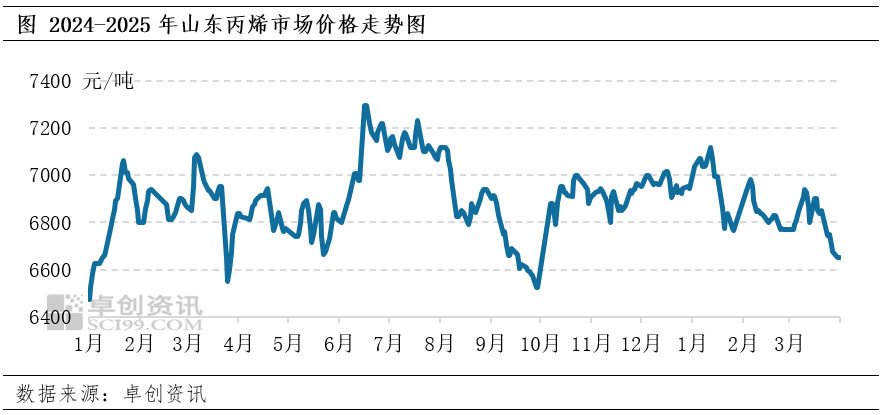 3月份国内丙烯阛阓价钱重点下探,供需复古转弱为影响丙烯价钱走势的主要影响身分。终局3月31日,山东丙烯阛阓主流成交6650元/吨,较月初价钱下降1.77%,较3月高点下降4.18%。该价钱涉及2024年9月底同期水平,为近半年以来的价钱最低点。