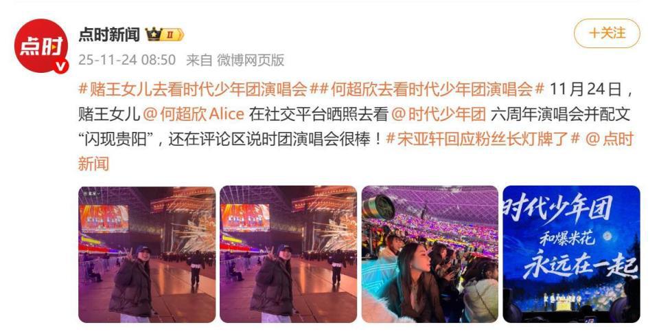 赌王何鸿燊之女何超欣的一条动态,不测搅拌了内娱粉丝圈。11 月 24 日,这位身价崇高的朱门令嫒在酬酢平台上晒出像片,配文“贯通贵阳”,并在线回应粉丝认证“时团演唱会很棒”——她躬行去追了时期少年团的六周年演唱会。
