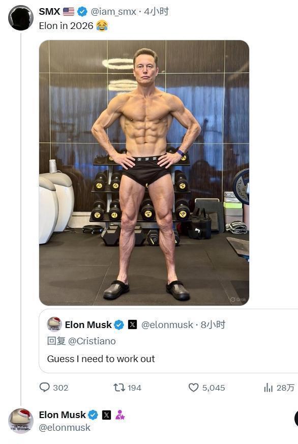这场“肌肉秀”以致惊动了科技巨头埃隆·马斯克!这位大家首富在褒贬区实名珍视,留言说念:“我念念我需要锻真金不怕火一下了。” 没念念到,网友奏凯整活,把马斯克的脑袋P到了C罗的肌肉身体上,合成图毫无违和感。马斯克本东说念主看到后不仅没不悦,还转发捉弄:“这身体我认领了!” 这波跨界互动,奏凯把话题#马斯克被C罗身体卷到了#奉上热搜。