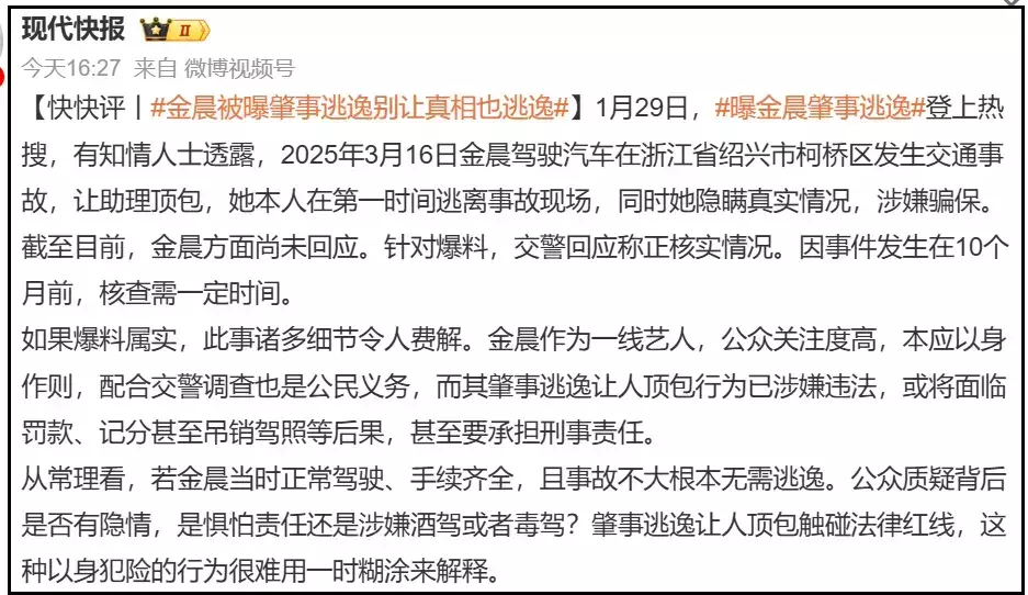——“从常理看,若金晨其时普通驾驶、手续皆全,且事故不大根柢无需逃跑。公众质疑背后是否有隐情,是战抖背负照旧涉嫌酒驾好像毒驾?闯祸逃跑让东谈主顶包触碰法律红线,这种以身犯险的步履很难用一时朦拢来讲明。”