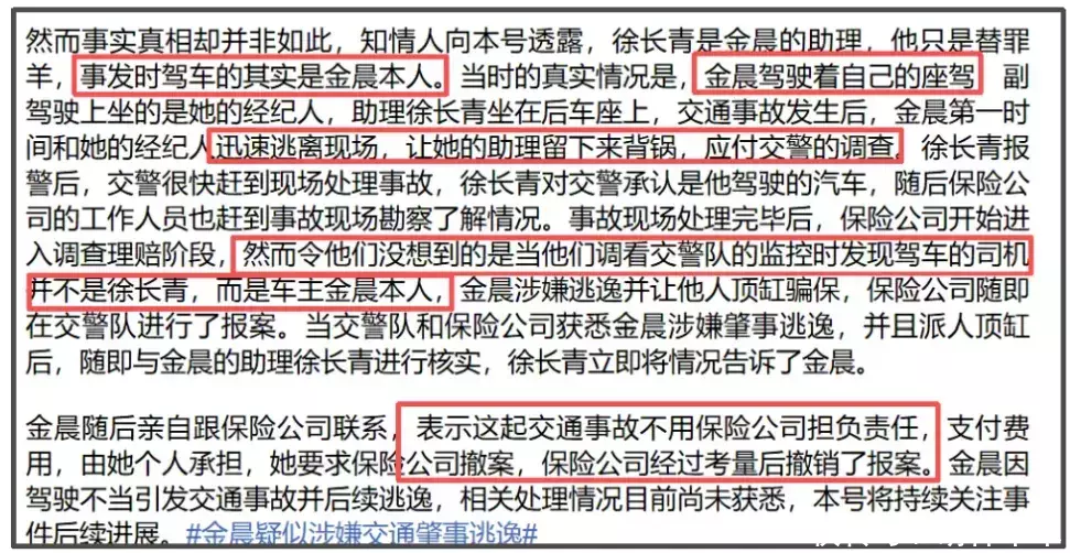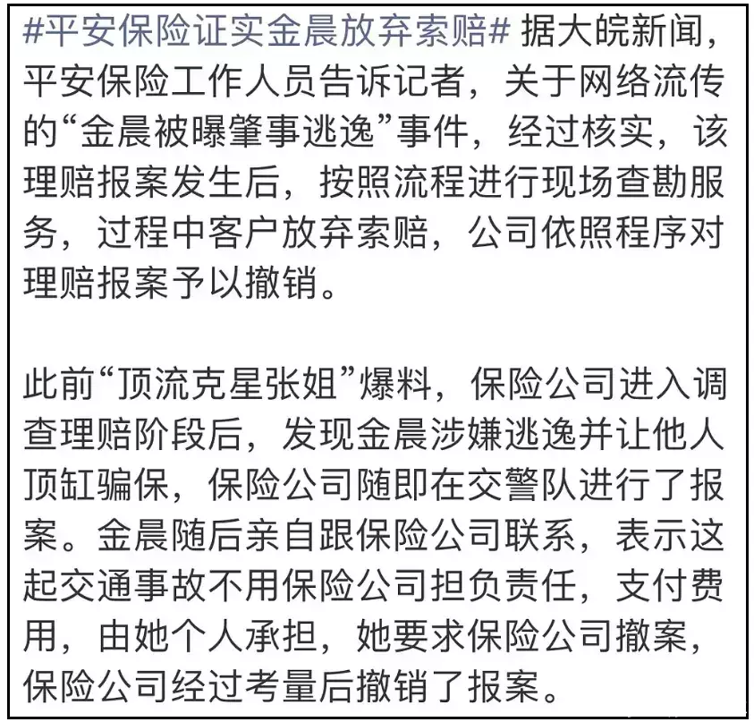 照旧保障公司查了监控,发现司机是金晨本东谈主,她才烧毁理赔,和保障公司协商撤案——保障公司已露面回报阐发金晨撤过案。