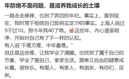 濒临行将到来的40岁,她说年龄毫不是问题,对咫尺的生涯很享受、很温和。