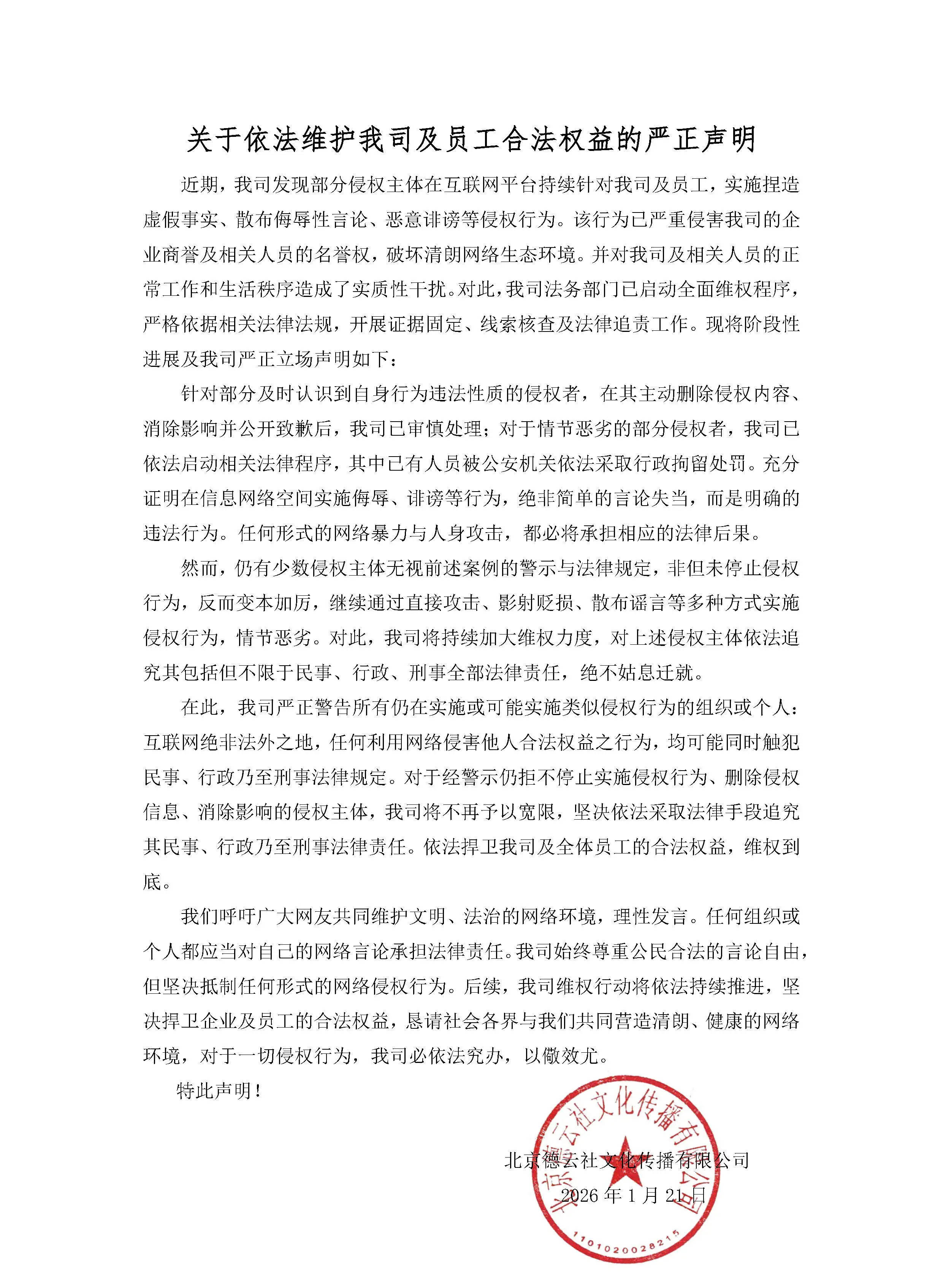 声明强调:“咱们命令高大网友共同认真精致、法治的网罗环境,感性发言。任何组合或个东谈主王人应当对我方的网罗言论承担法律牵扯。我司遥远尊重公民正当的言论解放,但顽强收敛任何状貌的网罗侵权行径。”